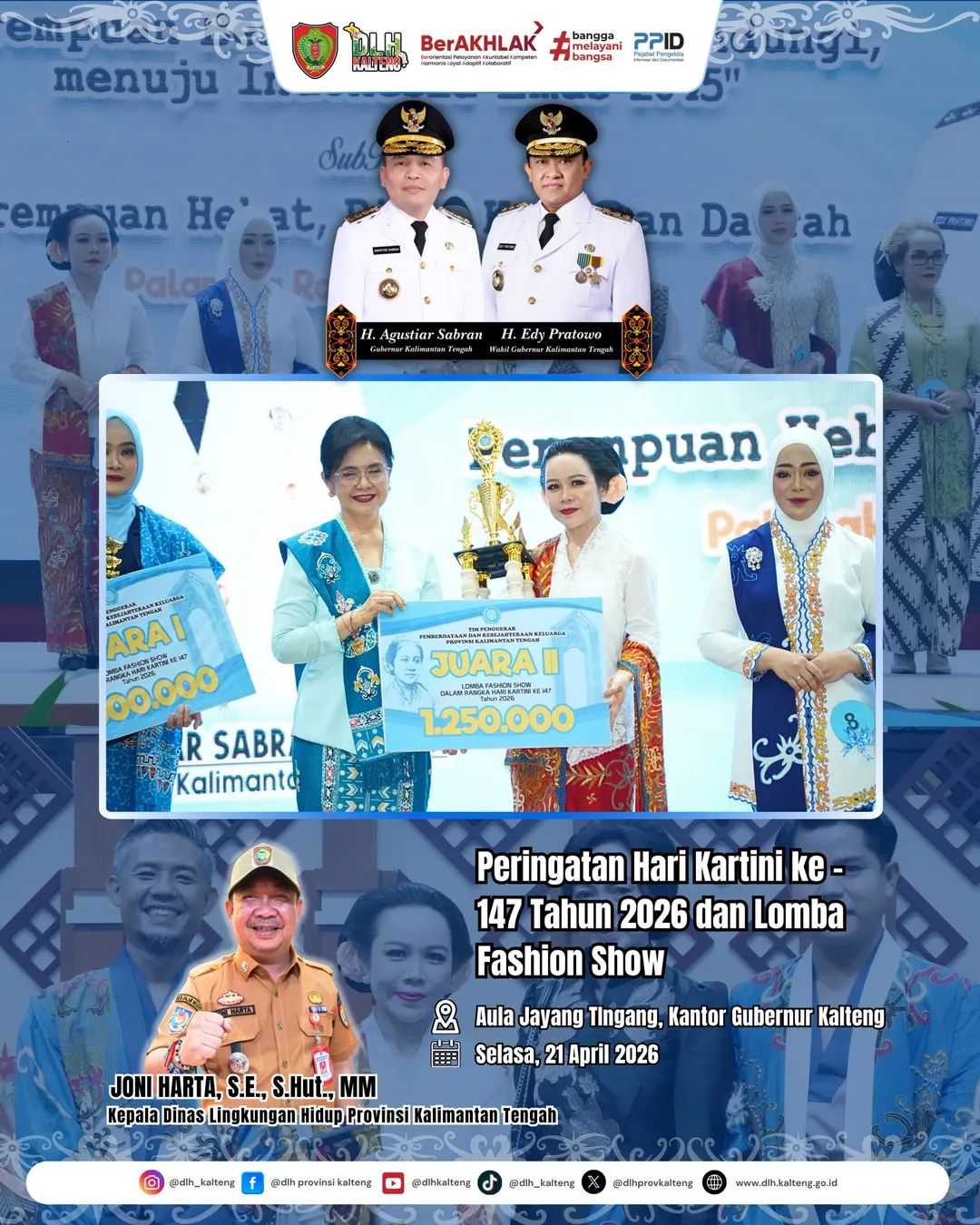 Ketua DWP DLH Provinsi Kalimantan Tengah, Ny. Gerryani Joni Harta, tampil memukau dalam ajang Lomba Fashion Show yang menjadi salah satu agenda utama. Dengan balutan busana yang mencerminkan keanggunan dan kekuatan perempuan masa kini, ia sukses meraih Juara II Fashion Show Peringatan Hari Kartini ke-147 Tahun 2026.