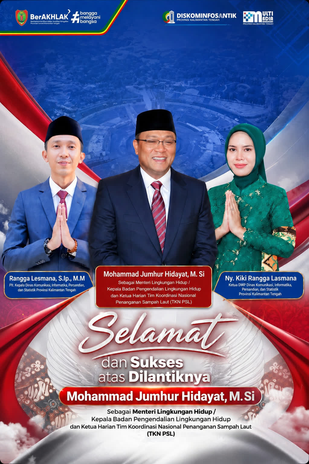 PALANGKA RAYA, SPN — Plt. Kepala Dinas Komunikasi, Informatika, Persandian, dan Statistik Provinsi Kalimantan Tengah, Rangga Lesmana, S.Ip., M.M, menyampaikan ucapan selamat dan sukses atas pelantikan Mohammad Jumhur Hidayat, M.Si sebagai Menteri Lingkungan Hidup, Senin (27/4/2026).