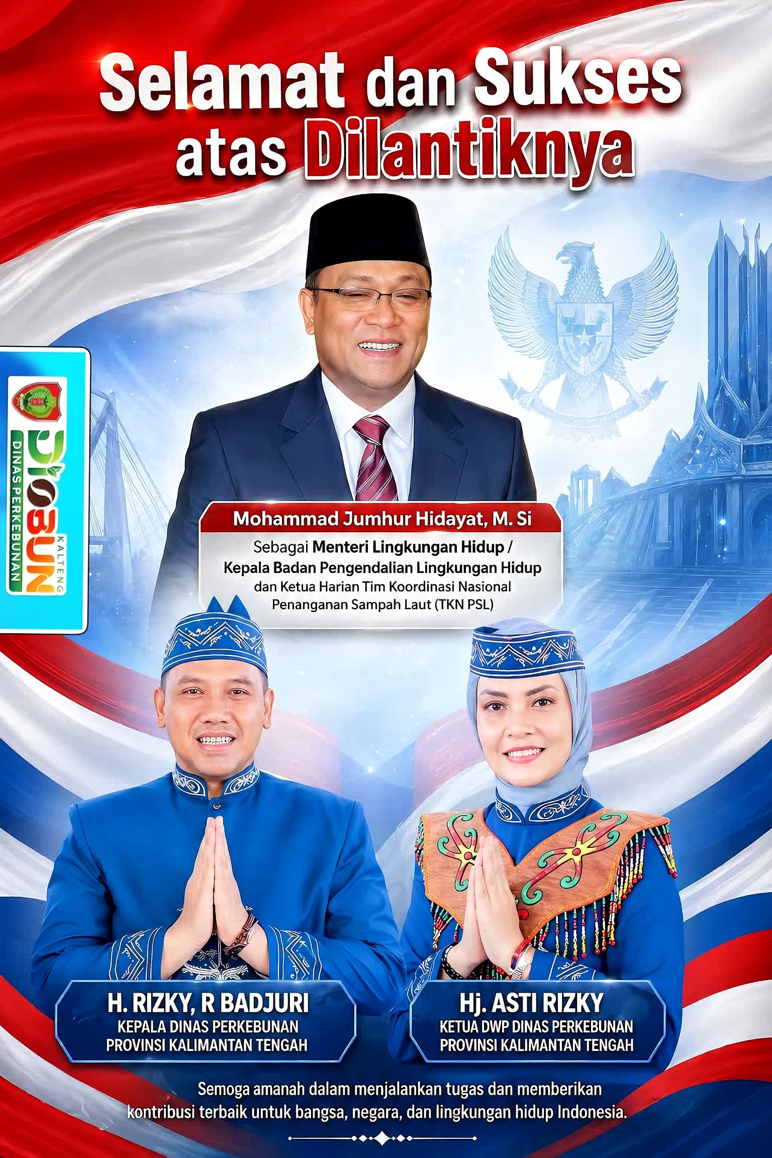 PALANGKA RAYA, SPN – Kepala Dinas Perkebunan Provinsi Kalimantan Tengah, H. Rizky R. Badjuri, bersama Ketua Dharma Wanita Persatuan (DWP) Dinas Perkebunan Provinsi Kalimantan Tengah, Hj. Asti Rizky, menyampaikan ucapan selamat dan sukses atas pelantikan Mohammad Jumhur Hidayat, M.Si sebagai Menteri Lingkungan Hidup.